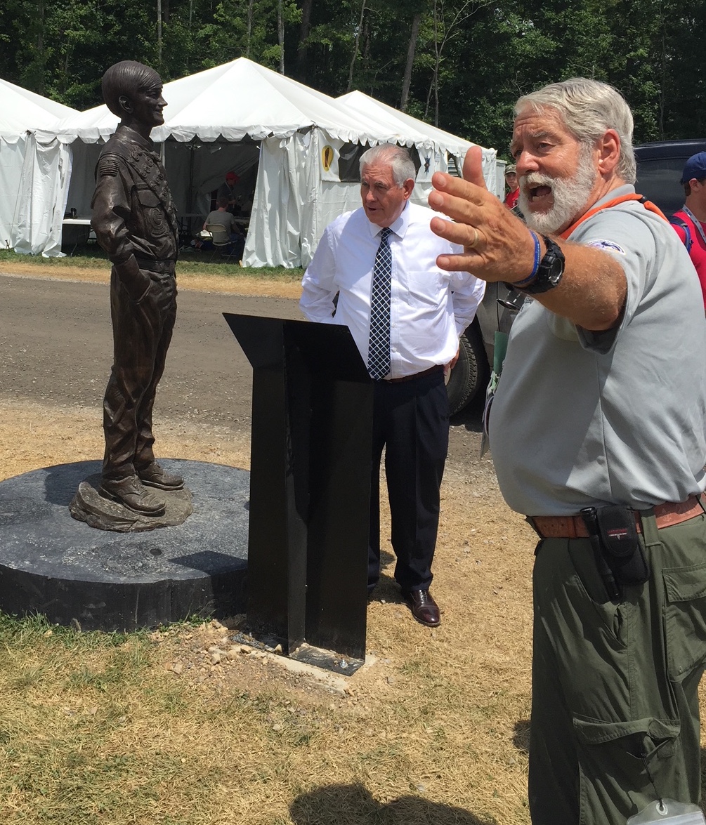 The photo above shows former BSA National President and US Secretary of State Rex Tillerson (center) reading the inscription on the statue honoring Stephen G. Marriott (left). On the right is Tony Mei, Chair of the Jamboree’s disAbilities Awareness Challenge, and of the BSA’s National Disabilities Awareness Task Force.